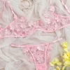 Floral Applique Embroidery Mesh Underwire Bra Set Pink